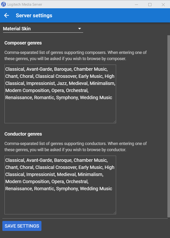 The Composer genre and Conductor genre fields determine what is shown in the Queue and Now Playing areas of Material