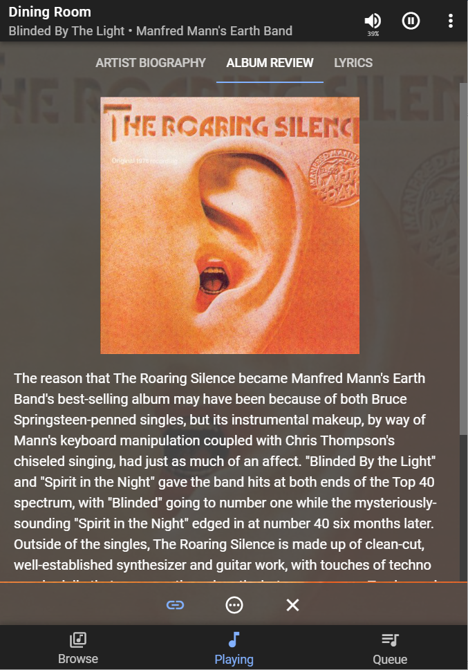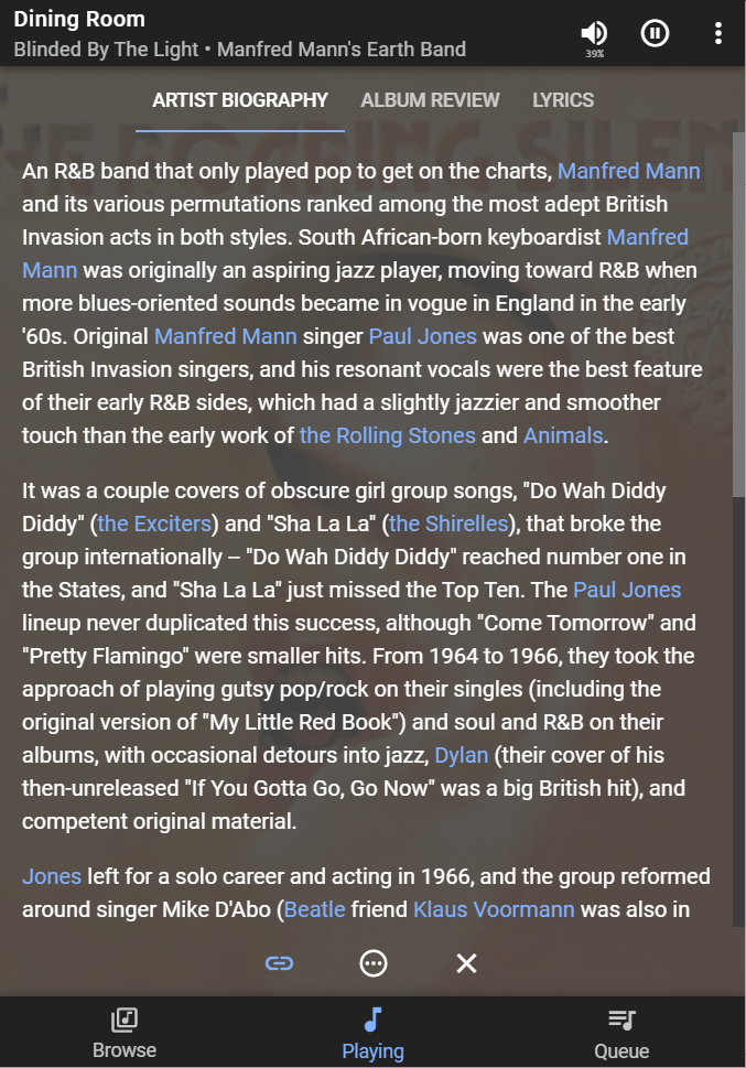 Material has been designed to make full use of the information provided via the Info button that appears when Music & Artist Information plugin (MAI) is installed.