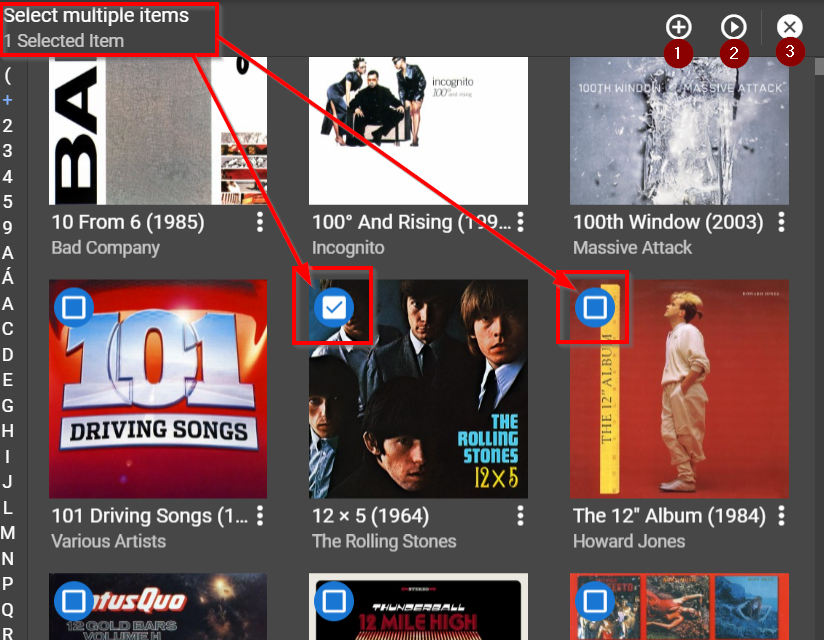 - Adds (all album tracks to end of Queue / selected track to end of Queue)