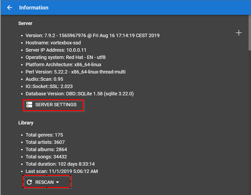 This displays information about your LMS environment but also gives you access to Server Settings and to Rescan your Library