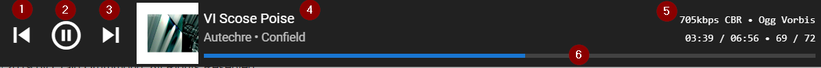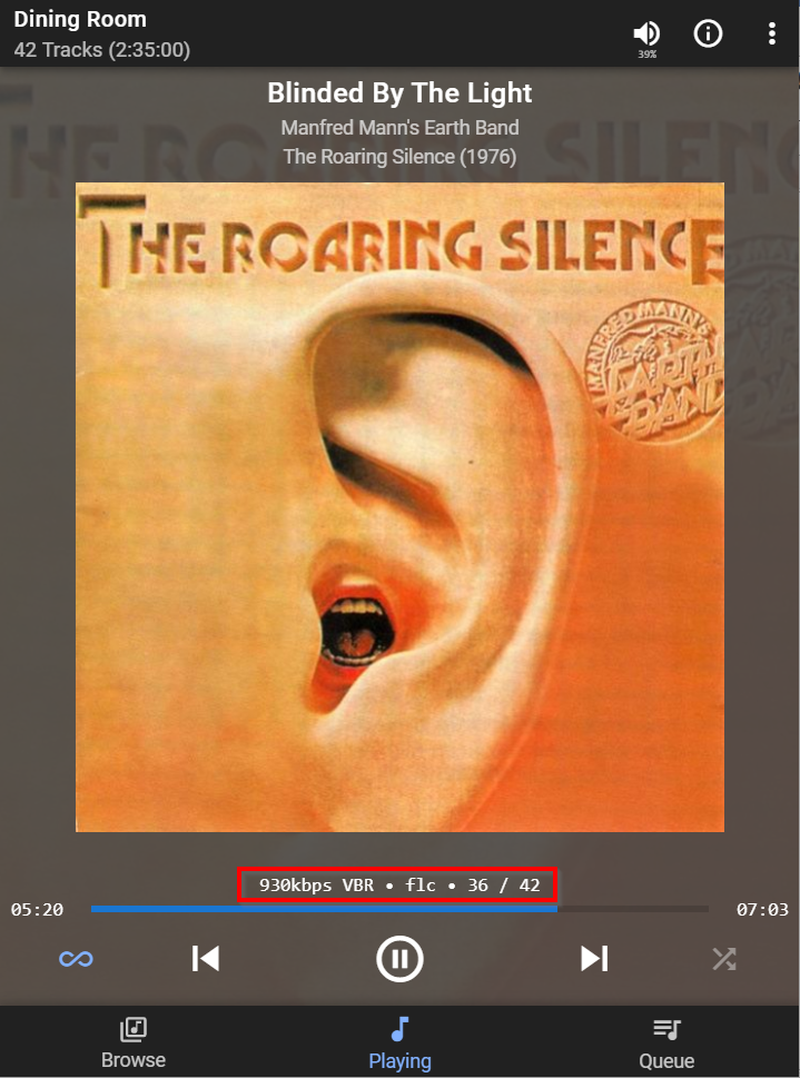 - Track playing - normally Track, Artist * Album but can be configured to display Composer and/or Conductor via Plugin Settings