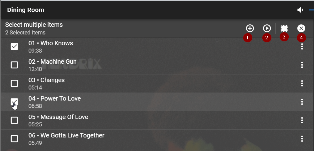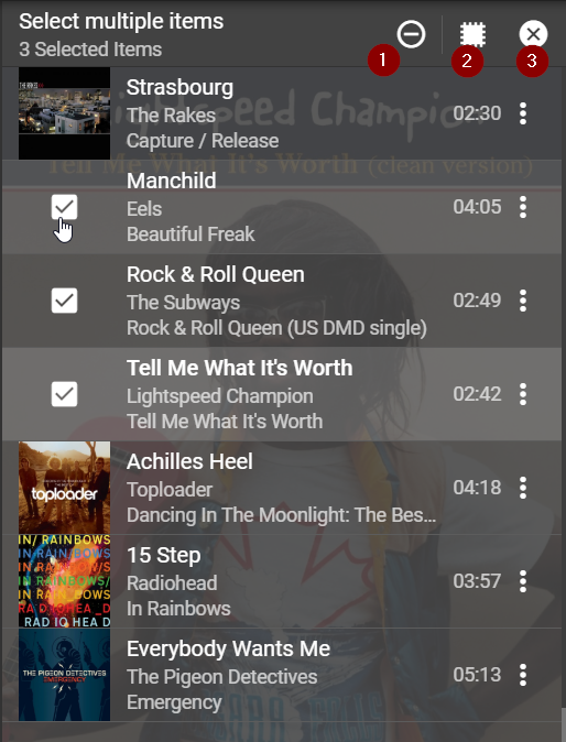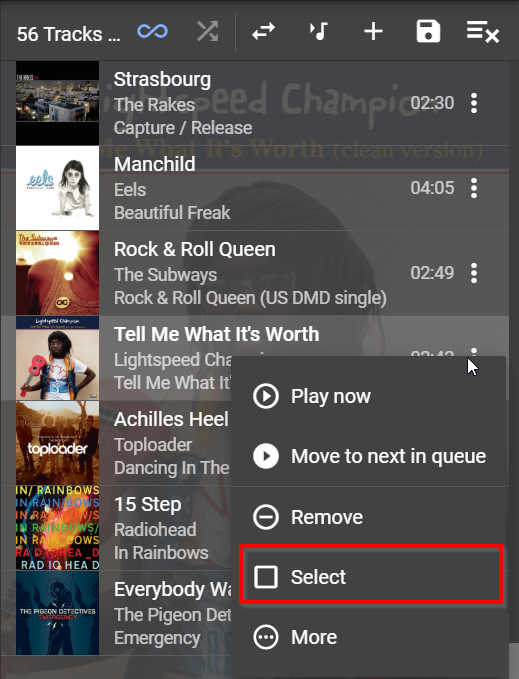 To select multiple items in the Queue or from a list of tracks in an album select any track and then access its Context Menu