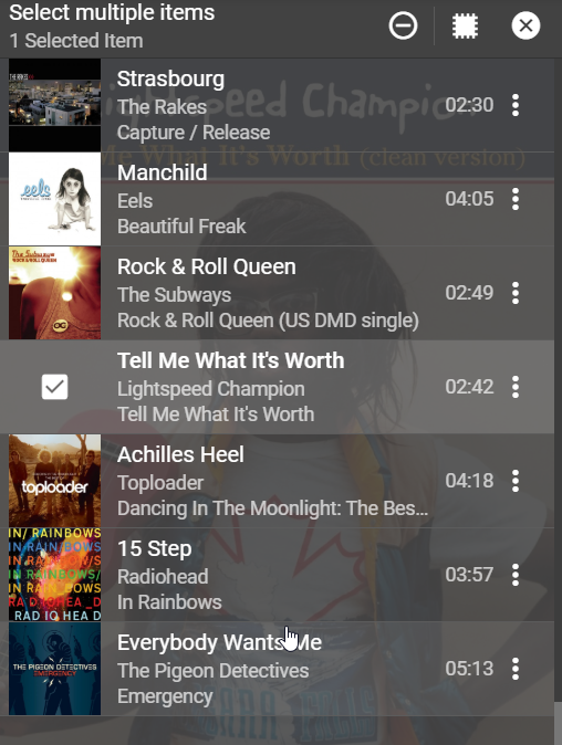 NB. In the queue no selection box appears but click on the cover art and it will select.