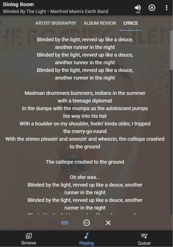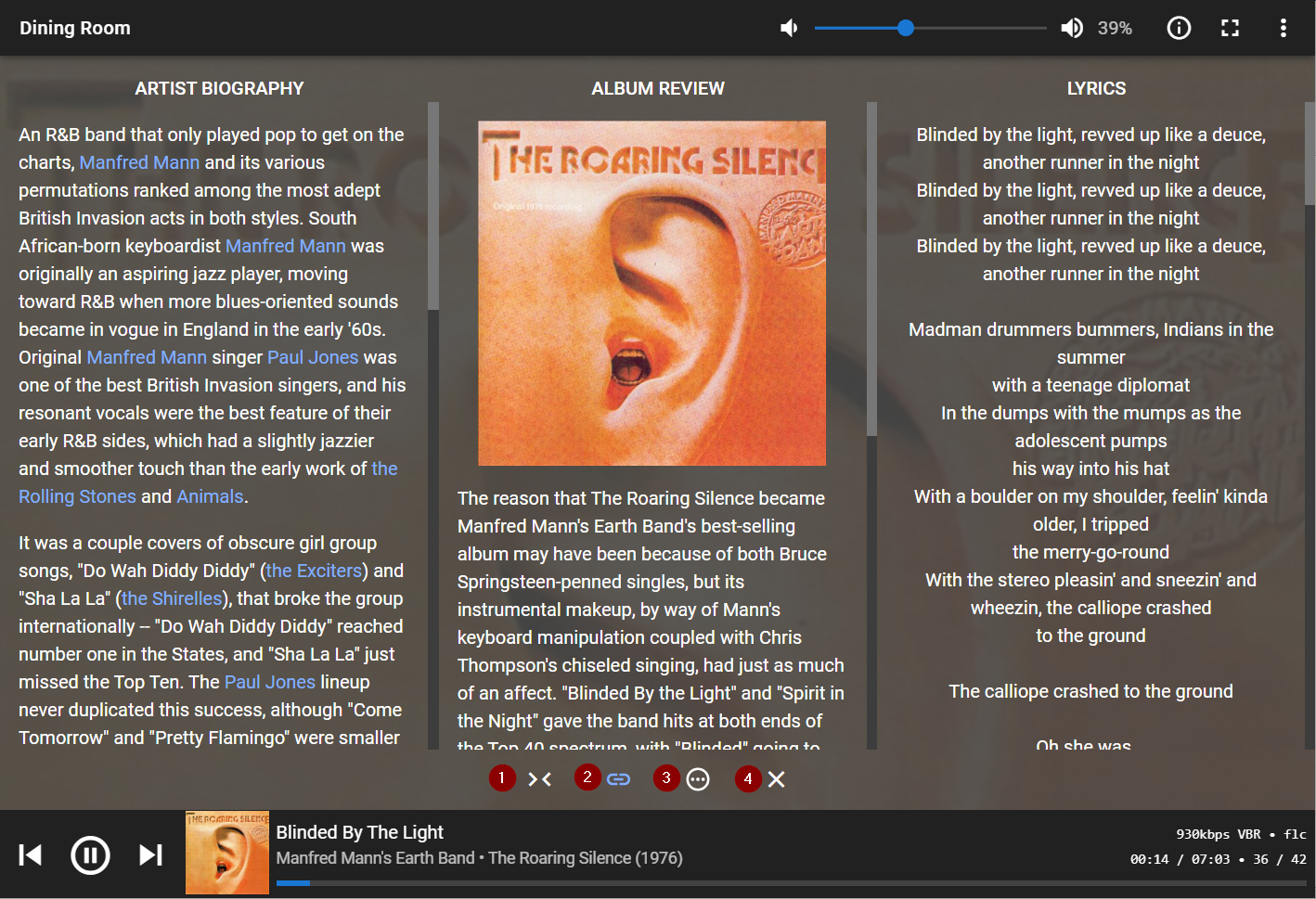 Material has been designed to make full use of the information provided via the Info button that appears when Music & Artist Information plugin (MAI) is installed.
